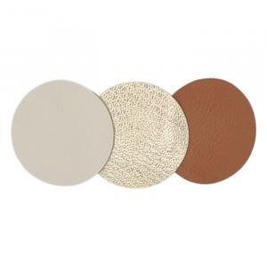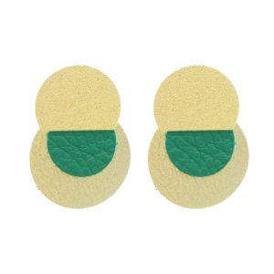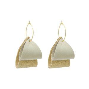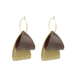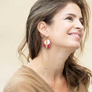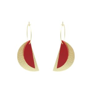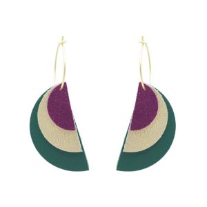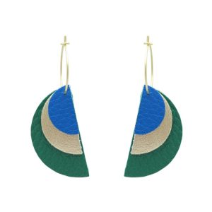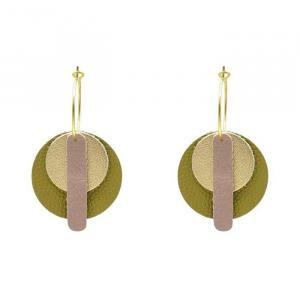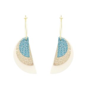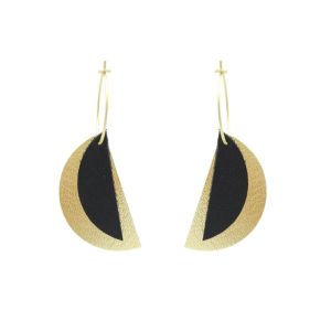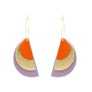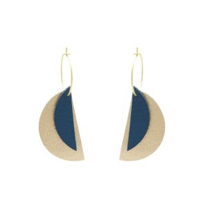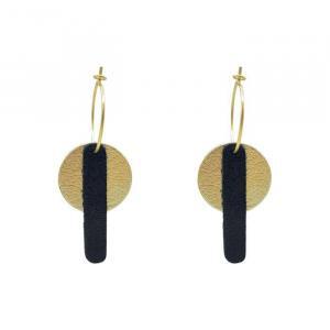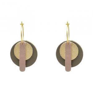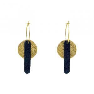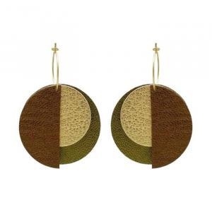 • Ces boucles made in France associent une créole dorée et trois pièces de cuir soigneusement superposées. Deux ronds de tailles différentes s’unissent à une demi-lune.