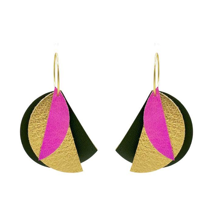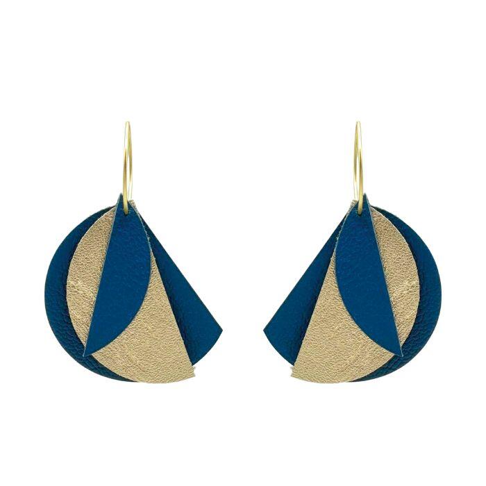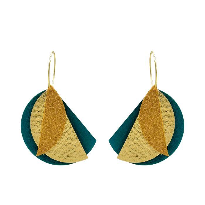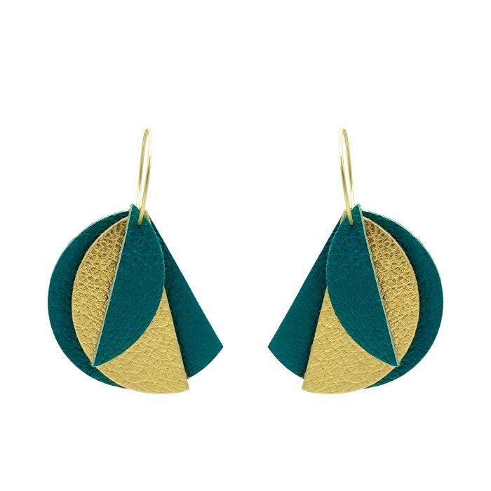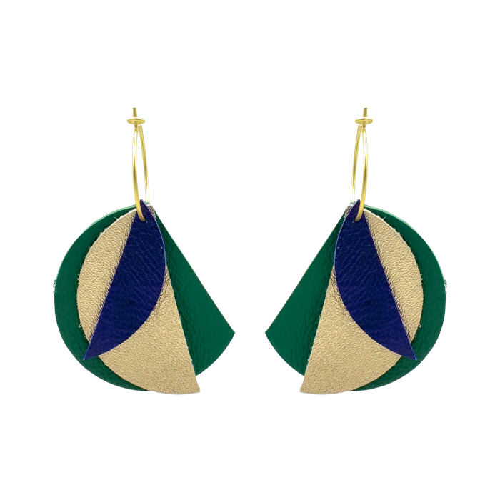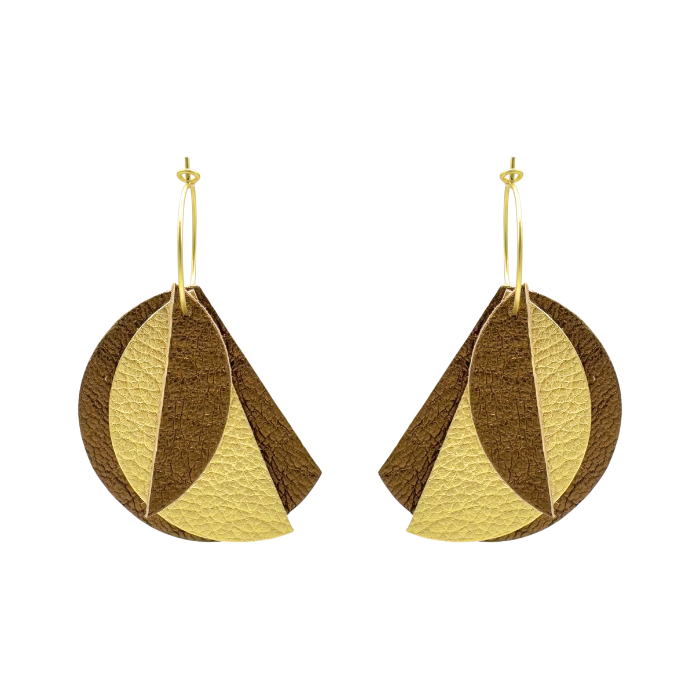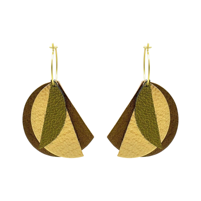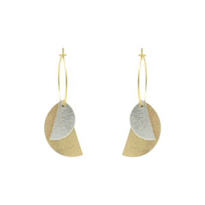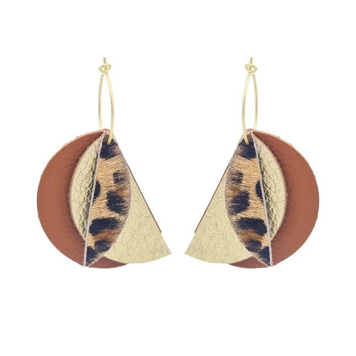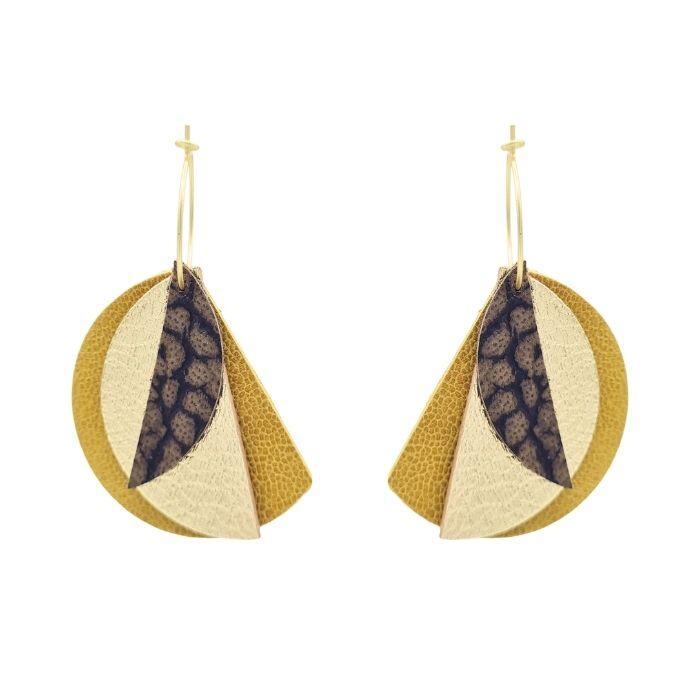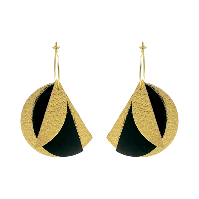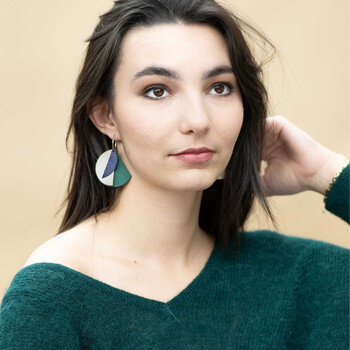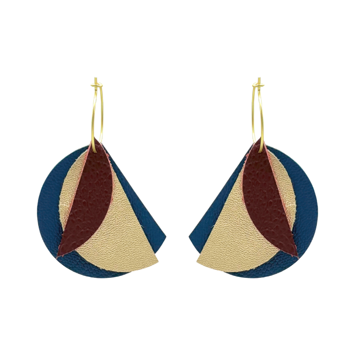 Créoles Efa. Elles sont fabriquées en France dans une démarche éco-responsable, à partir de chutes de cuir. Elles sont graphiques et très légères. Vous pouvez vous permettre de porter de grandes boucles d’oreilles sans abimer les lobes des oreilles.
