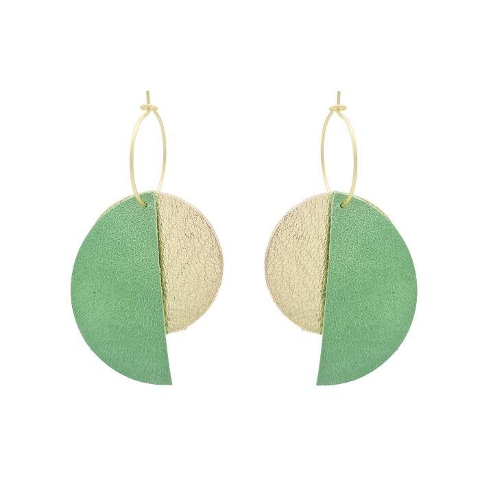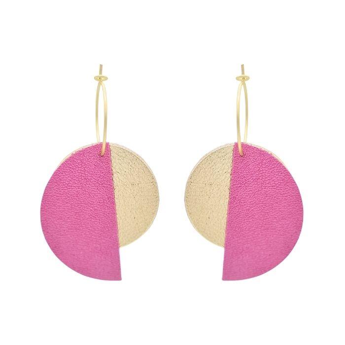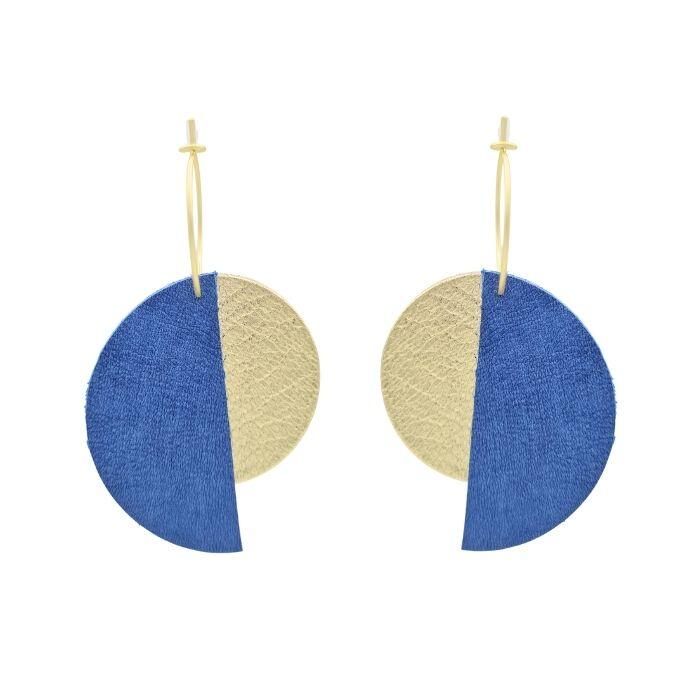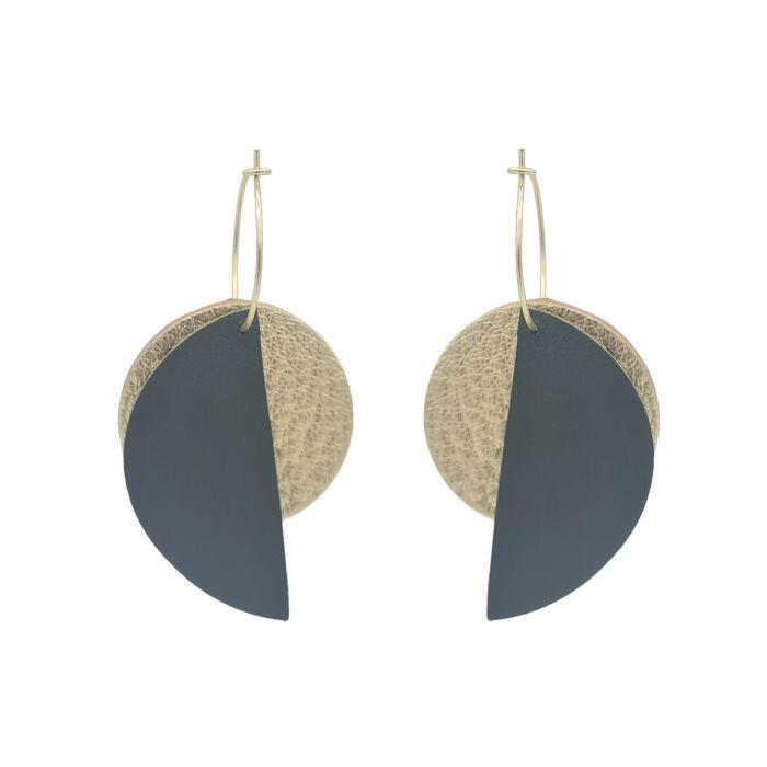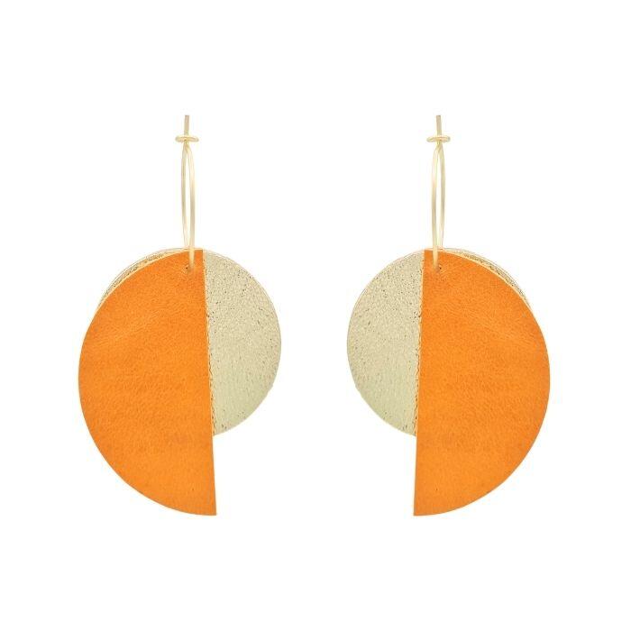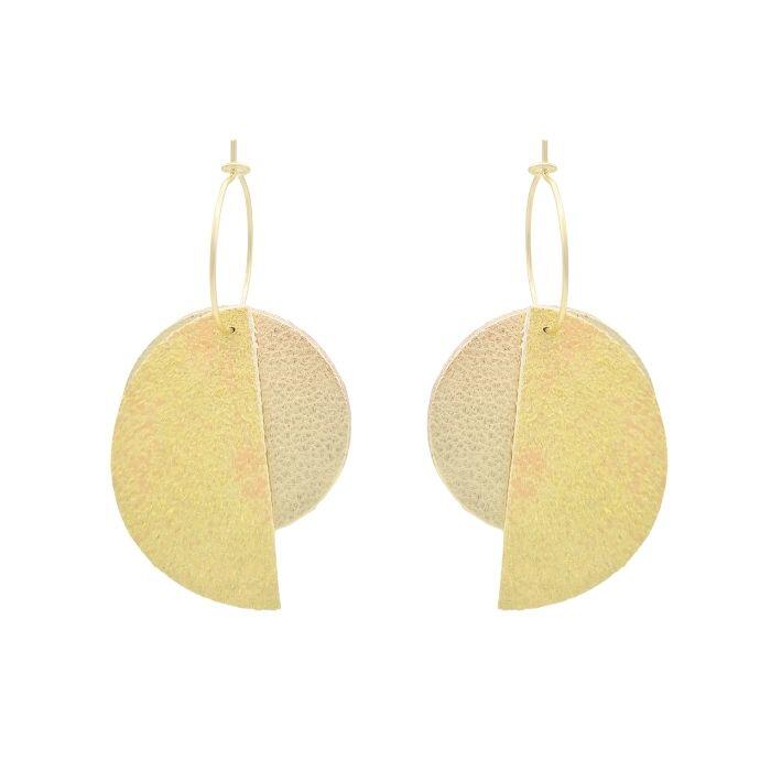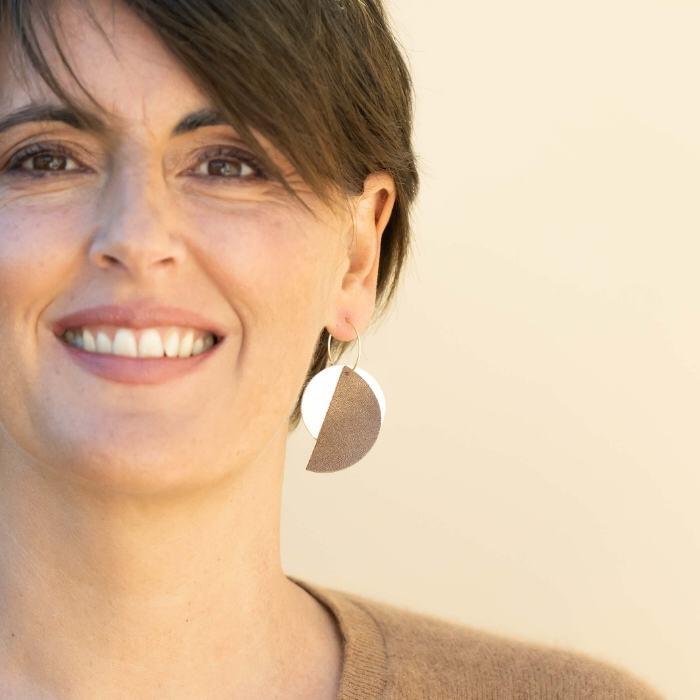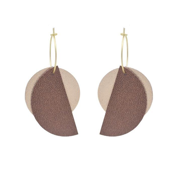 Bijoux tendances en cuir. Boucles d’oreilles ultra légères en chutes de cuir, bicolore avec un rond et une demie lune. Ces créoles graphiques revisitées sont très légères et donc facile à porter sans abîmer les lobes des oreilles.