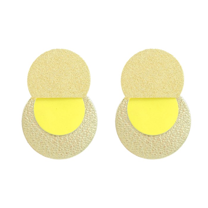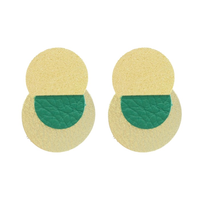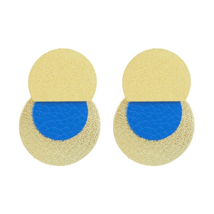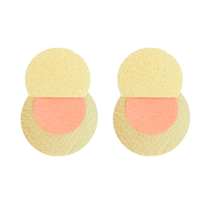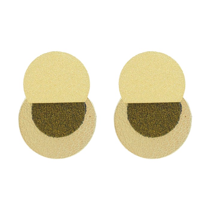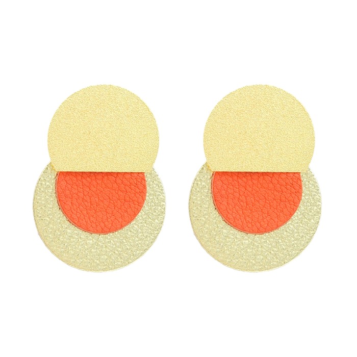 Puces d’oreilles graphiques métal dorées et cuir couleurs.