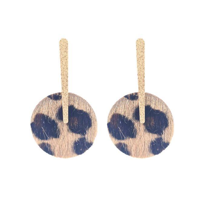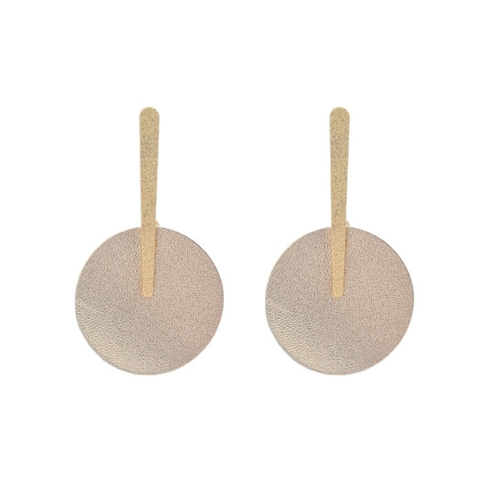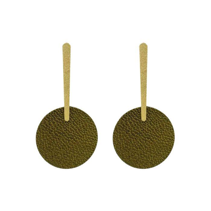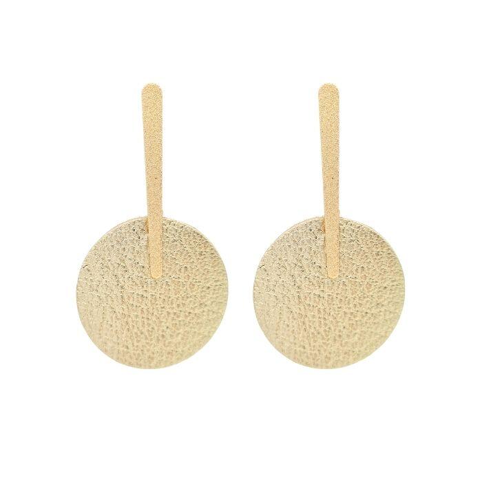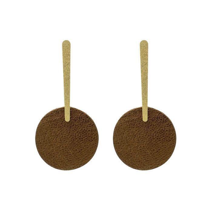 Cadeau éthique femme. Boucles d’oreilles Lili. Puces d’oreilles métal avec rond en chutes de cuir. Attaches tiges longues dorées légèrement martelées et rond en cuir.