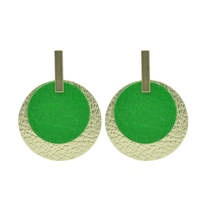 Puces créoles revisitées en chutes de cuir. Attaches dorées mat, fines et sobres avec 2 ronds de cuir, doré et coloré. Design graphique et contemporain.