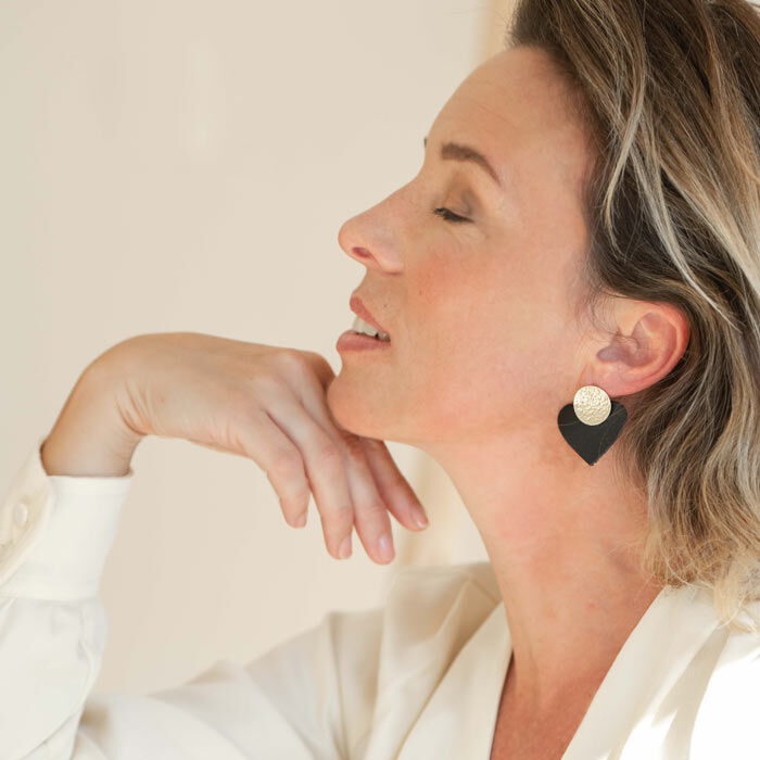 Puces d’oreilles toute en rondeur avec un cœur en chute de cuir. Esprit vintage, look très graphique et tellement tendance, on adore!